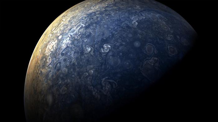 Нечто подобное можно наблюдать и на Земле, когда после обильного дождя в лужи на асфальте попадает машинное масло. На самом деле это огромные газовые облака, скрученные турбулентностью в замысловатые спирали. Фотография была сделана в тот момент, когда Juno пролетал над северным полушарием Юпитера.