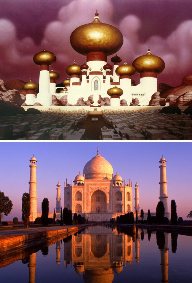 4. Белоснежные стены и золотые купола дворца из мультфильма «Аладдин» очень напоминают этот мавзолей. Создатели лукаво умалчивают, откуда они срисовали дворец султана, но на прямой вопрос «А не с Тадж-Махала ли?» отвечать «Нет!» не спешат.