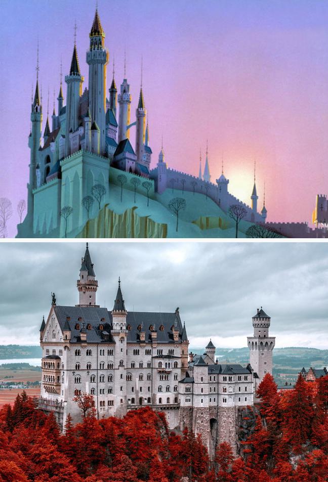 3. Замок Спящей Красавицы: «Новый лебединый замок» расположен на одном из баварских холмов близ австрийской границы. Уолт Дисней впервые увидел Нойшванштайн в 30-е годы прошлого столетия во время путешествия по Европе. Возвышающийся над безлюдными баварскими лесами замок показался аниматору вратами в сказочный мир.