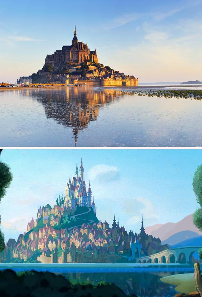 6. Гора Мон-Сен-Мишель с крепостью, расположенная в 285 километрах от Парижа, на северо-западном побережье Франции, напоминает королевский дворец из мультфильма «Рапунцель: Запутанная история».