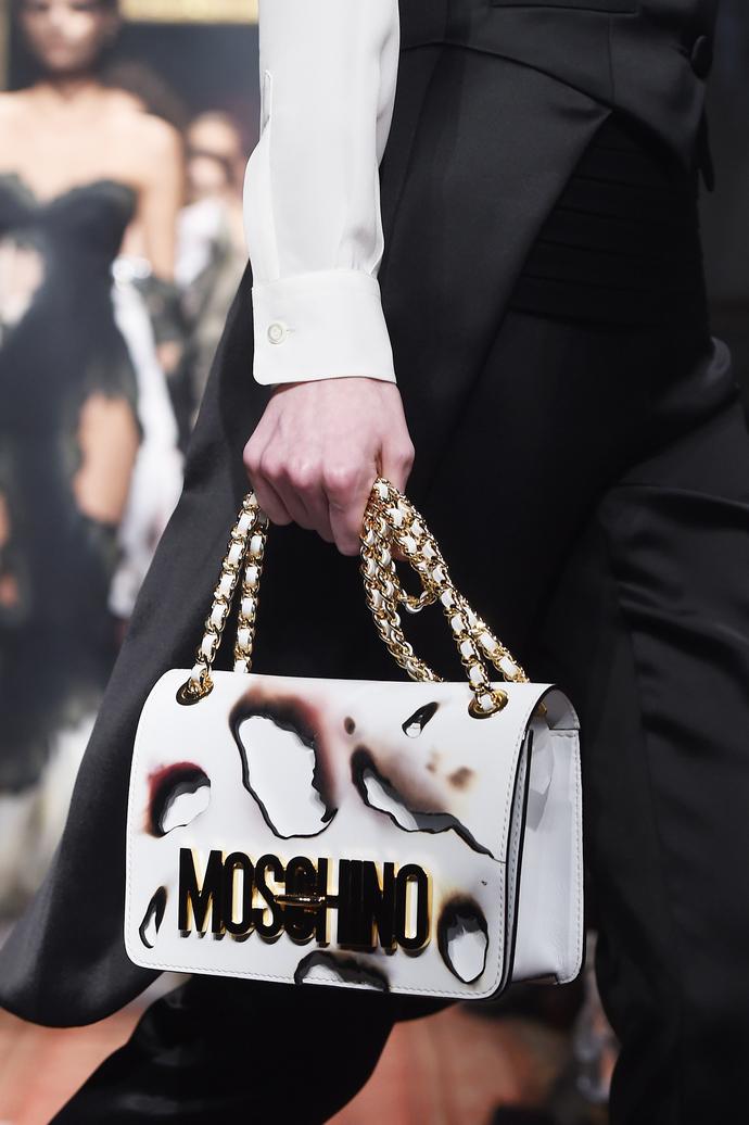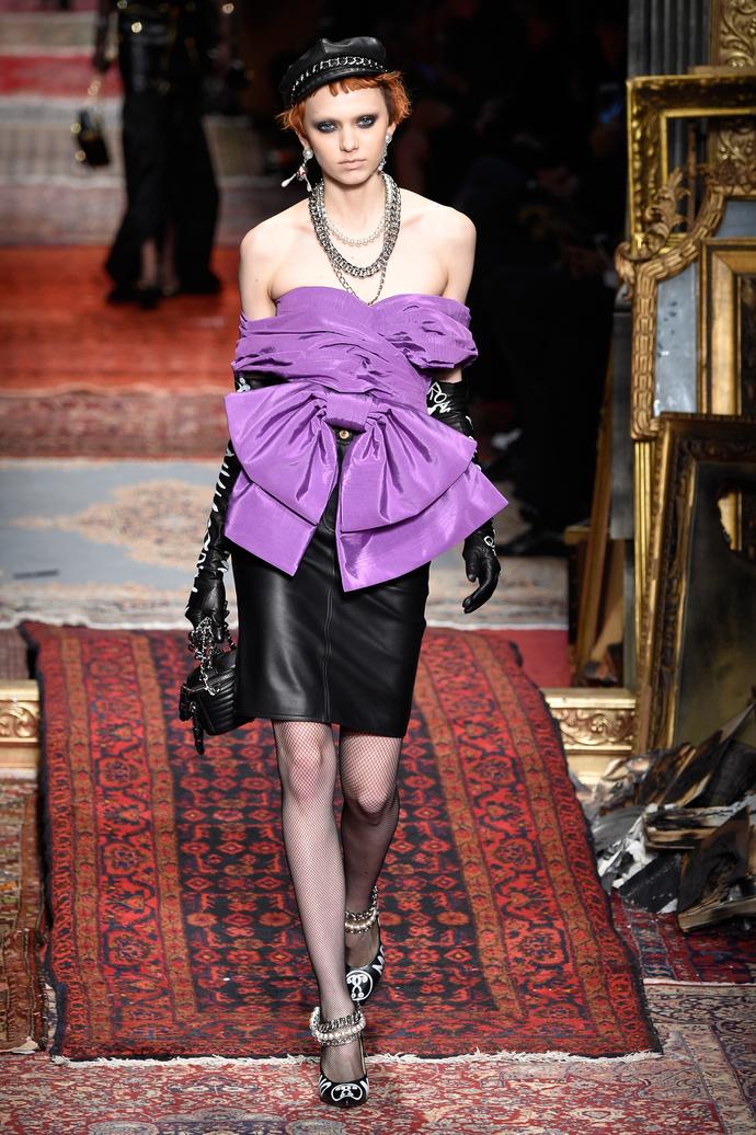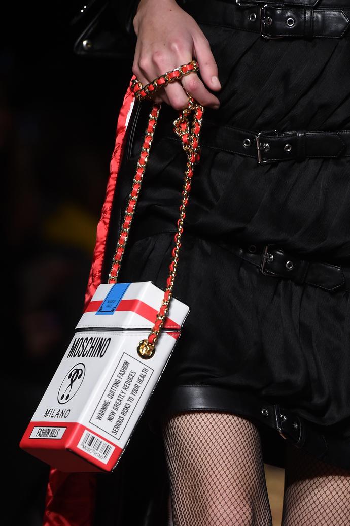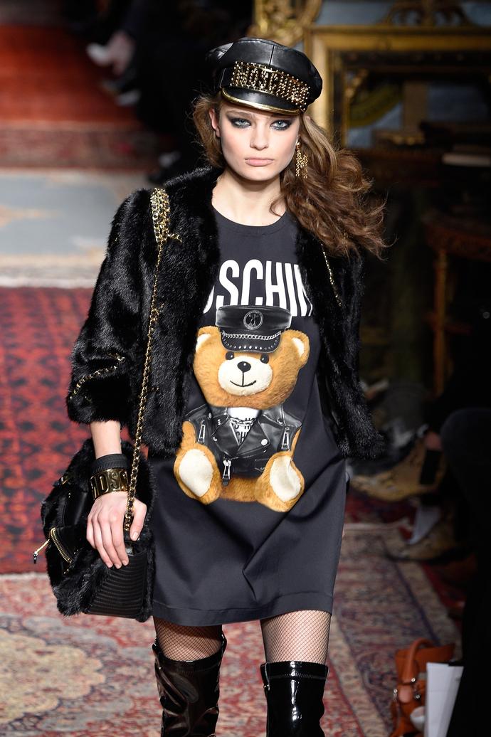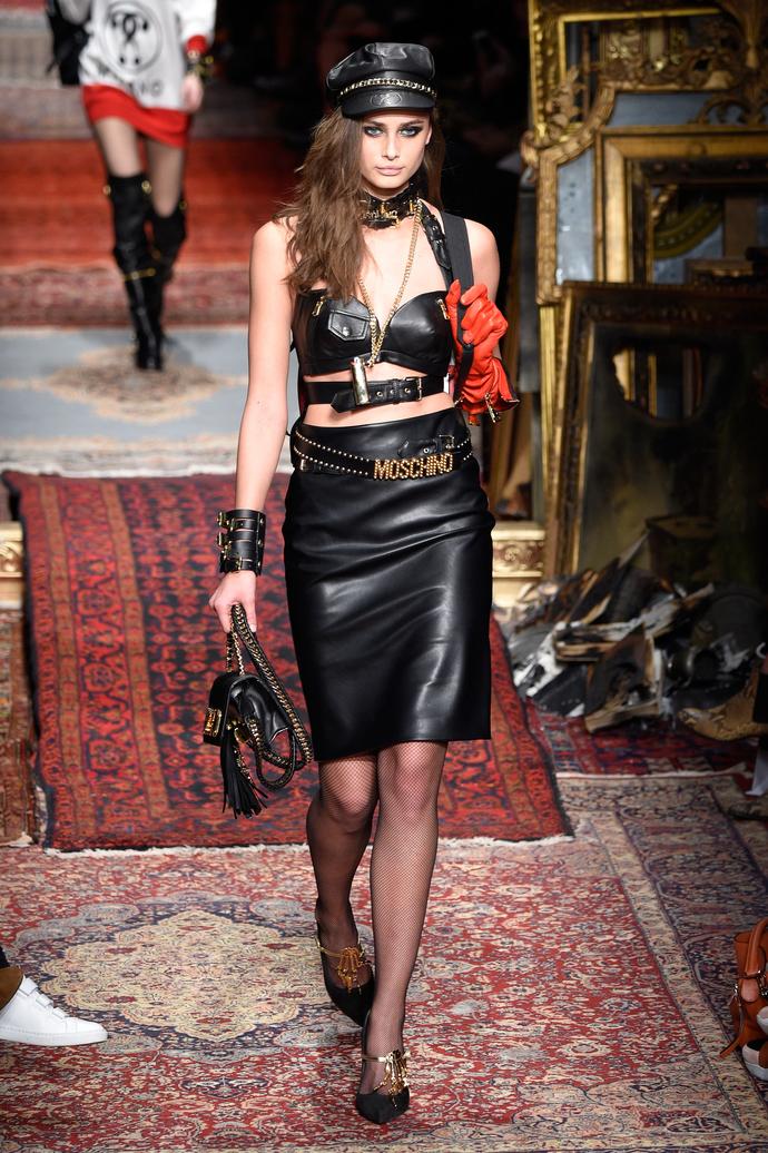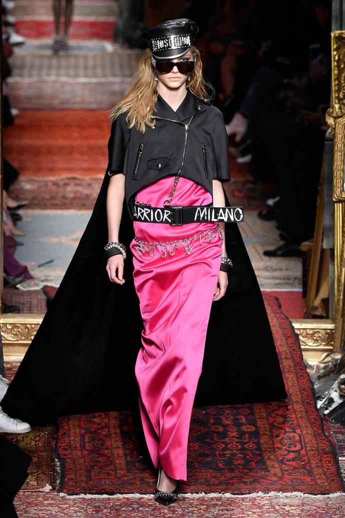 Именно такие образы открывали осенне-зимнюю коллекцию Moschino: микро-платья и такие же шорты из кожи, полицейские кепки, тяжелые чепи с черепами, корсеты и скрипящий деним. Это девушка-воин, что собственно и было написано на кепках моделей. Часть, посвященную курению и дыму, стала заключительной ― сперва появились модели в словно обожженных платьях, а потом на подиум-красный ковер (еще одна, на этот раз визуальная шутка) выплыла модель Анна Кливленд: из ее платья на самом деле валил дым!