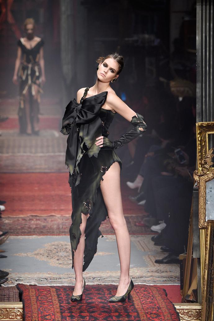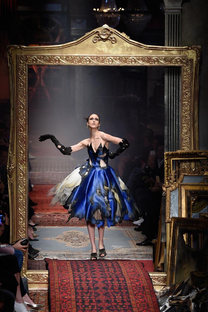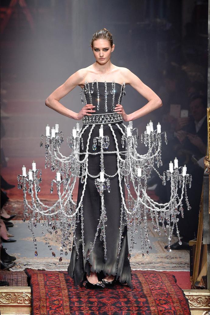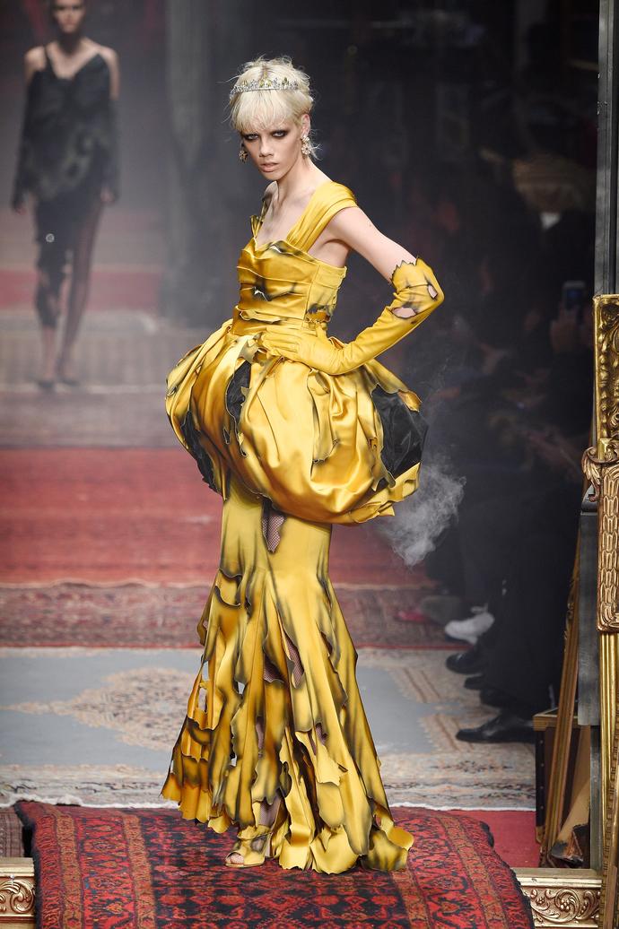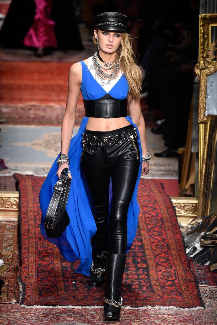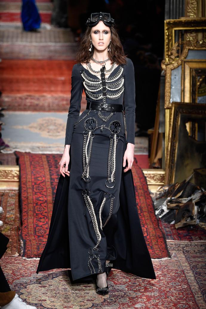 Именно такие образы открывали осенне-зимнюю коллекцию Moschino: микро-платья и такие же шорты из кожи, полицейские кепки, тяжелые чепи с черепами, корсеты и скрипящий деним. Это девушка-воин, что собственно и было написано на кепках моделей. Часть, посвященную курению и дыму, стала заключительной ― сперва появились модели в словно обожженных платьях, а потом на подиум-красный ковер (еще одна, на этот раз визуальная шутка) выплыла модель Анна Кливленд: из ее платья на самом деле валил дым!