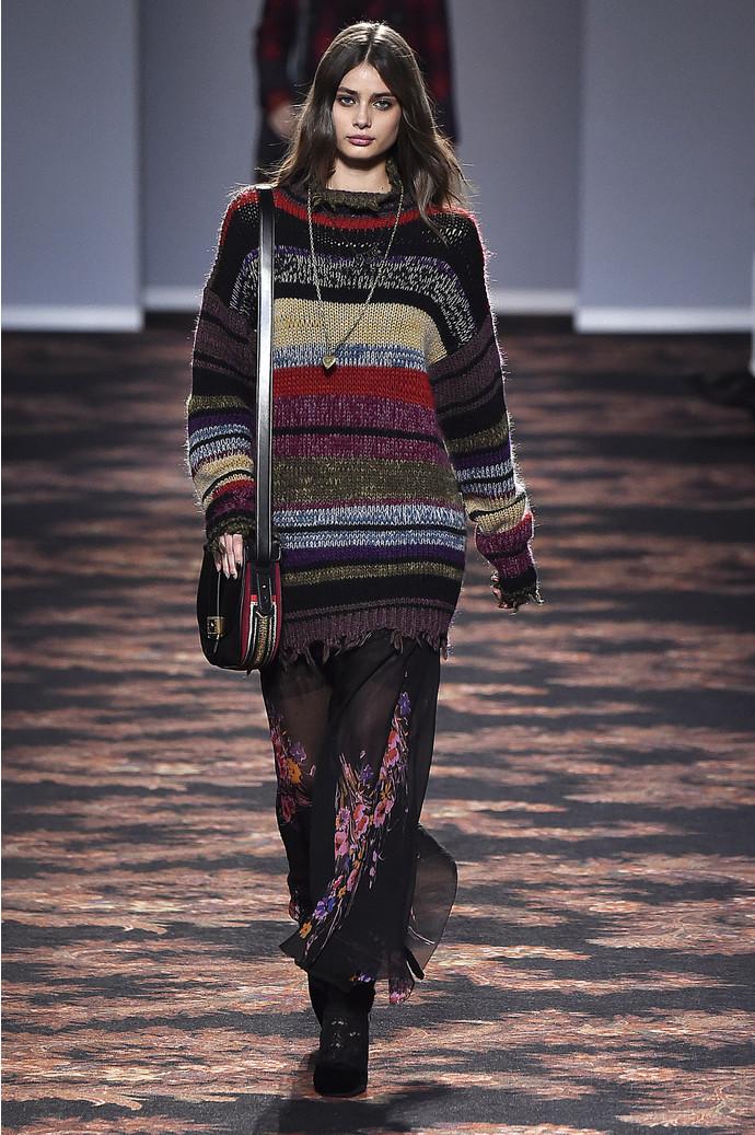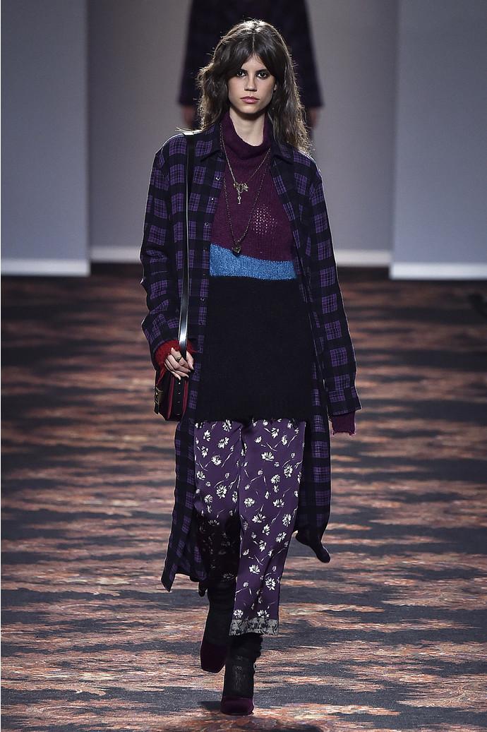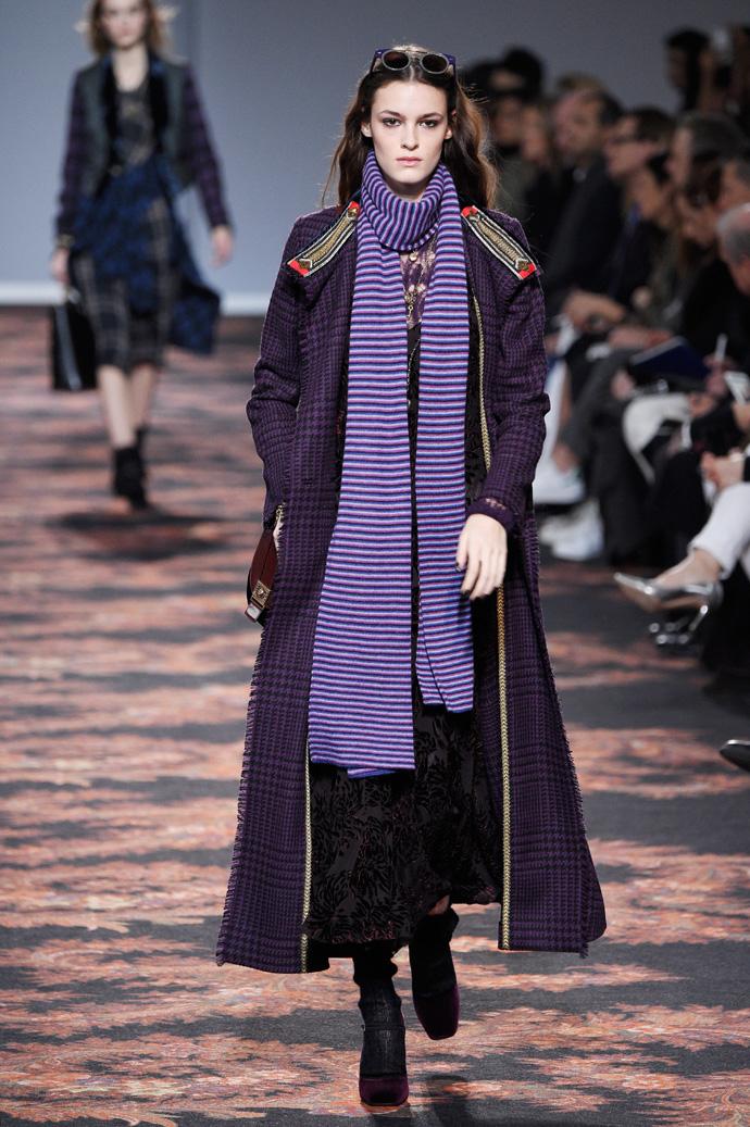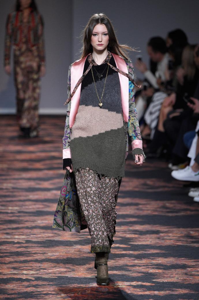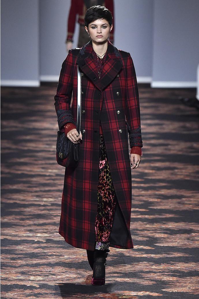 На показе в Милане, двадцать восьмого февраля, Вероника Этро осталась верна стилю бренда только отчасти: осенней коллекции – осенняя палитра с насыщенными ягодными и травяными оттенками. В остальном узнаваемая эклектика Etro оказалась замешана с непривычным для марки гранжем: длинные расслабленные юбки с принтом сочетались на подиуме с объемными джемперами, богемными принтованными пальто в пол, кожаными косухами и классикой 90-х – повязанными на поясе клетчатыми рубашками.