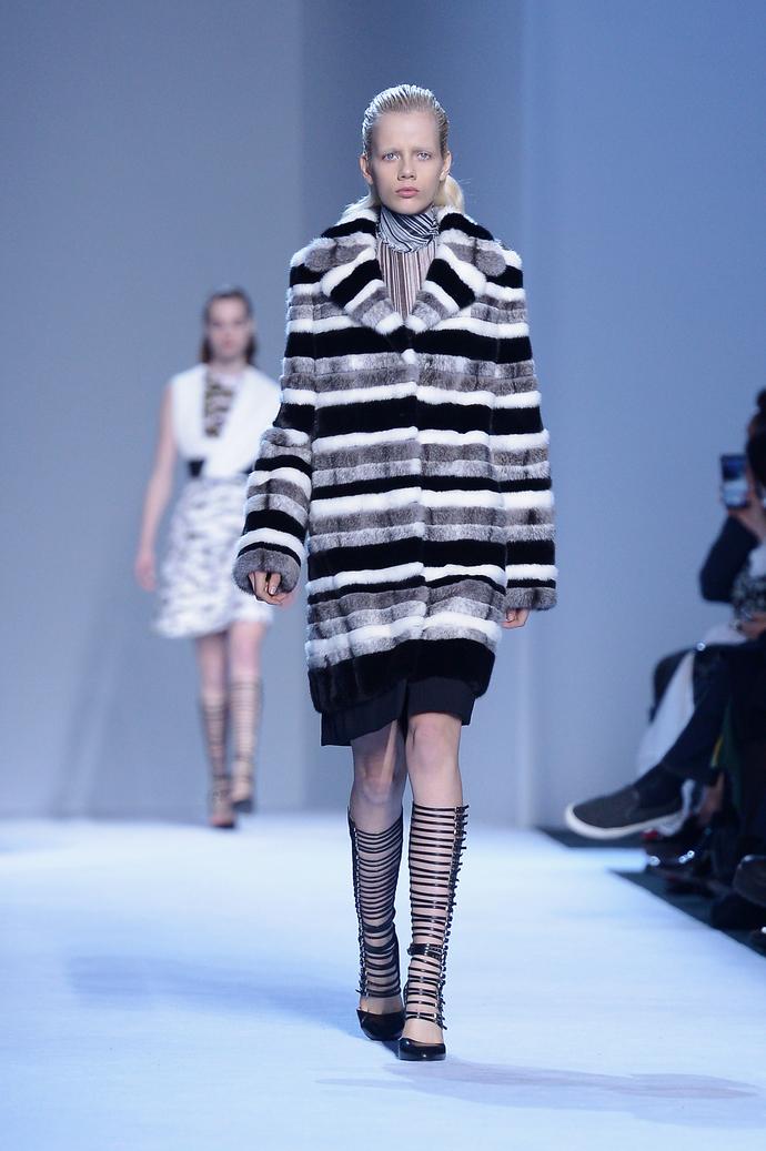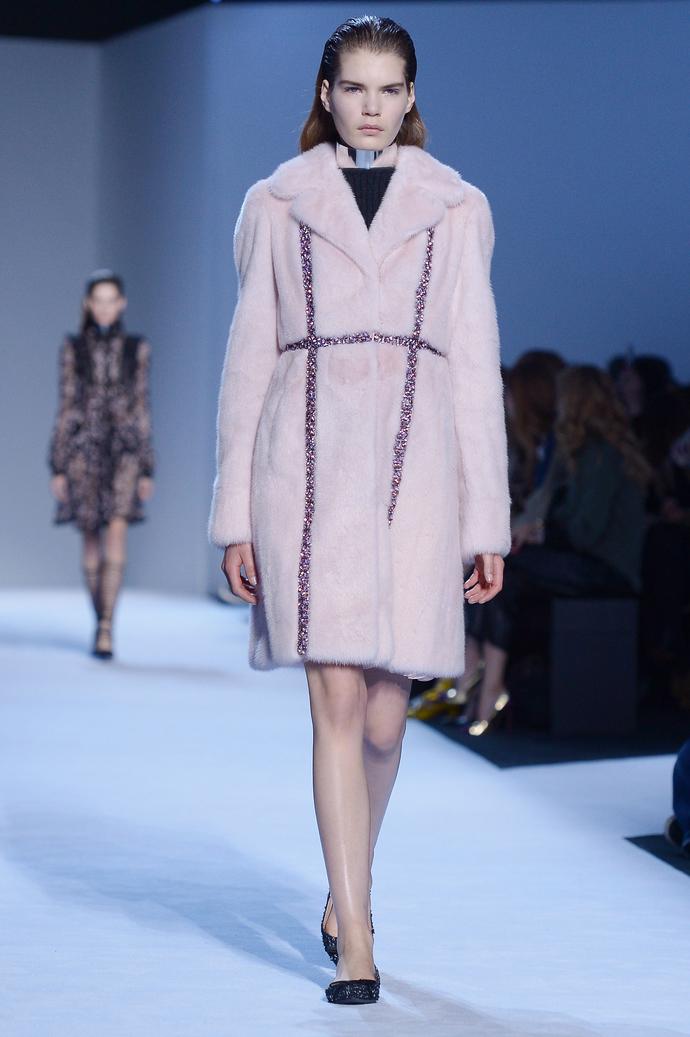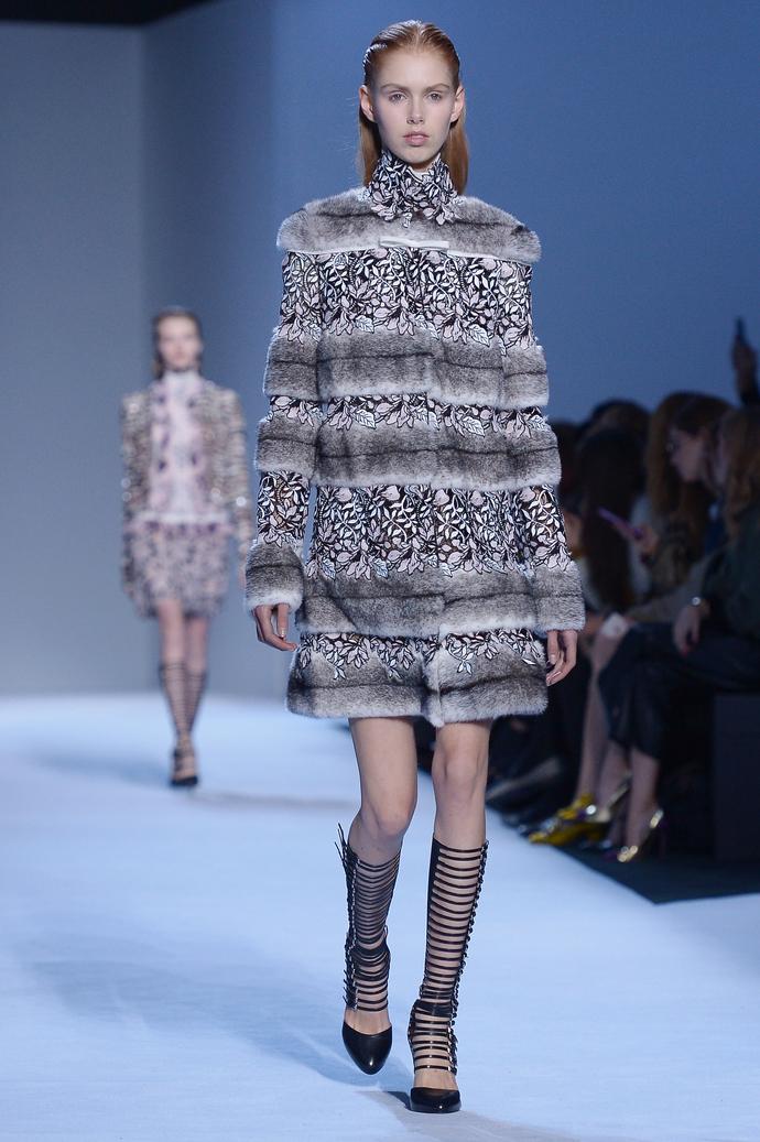 В многослойных комплектах - платье с кроп-топом, юбка и жакет прямого кроя, платье и удлиненный жакет с мехом - возникала игра на контрасте оттенков и фактур: вышитые яркие орнаменты «сталкивались» с плиссировкой или, напротив, объемным мехом. О том, как мастерицам ателье Gaimbattista Valli удается добиться такого эффекта, остается только догадываться.