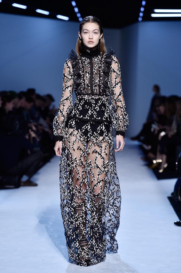 И то, и другое, и третье можно было увидеть в сегодняшнем шоу! Вышивка 3D, узоры, выложенные пайетками, цифровые принты, цветной мех, эксперименты с плиссировкой и многослойными платьями из прозрачных и плотных фактур - Giambattista Valli снова доказал, что может из сезона в сезон задавать новую планку в дизайне вечерней одежды. Первые выходы представили новый для марки цветочный узор, выполненный в нескольких вариантах - от черно-белого до цветного. Затем к нему добавились digital-принты с фрагментами того же орнамента; давно любимые дизайнером изображения цветущей сакуры, мелкие полевые цветы (максимально лишенные детализации) и объемная цветочная вышивка, напоминающая скорее абстрактный рисунок, чем растительный мотив.