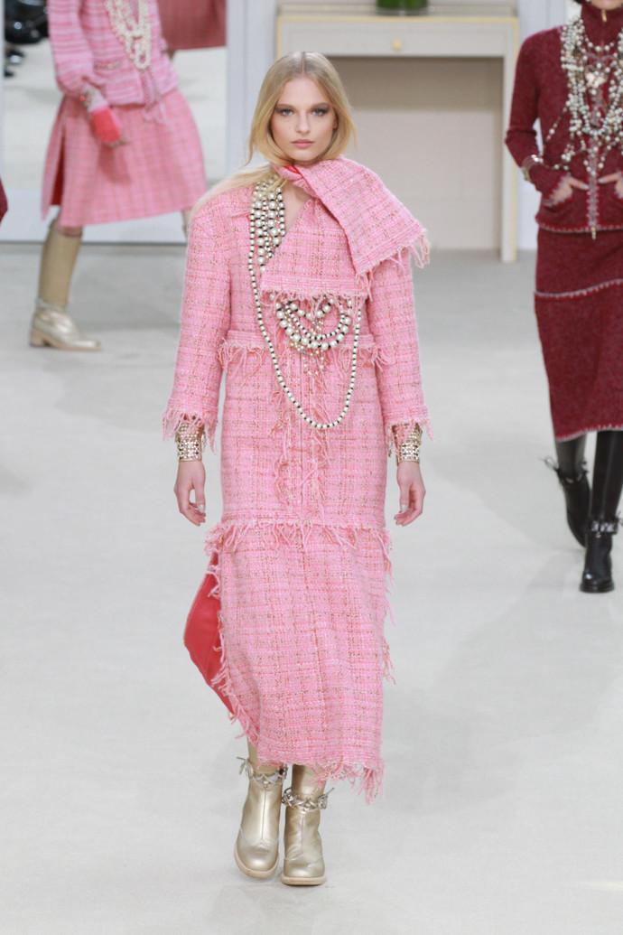 Начав с блока, состоящего из интерпретаций знакового твидового жакета в розовой цветовой гамме и дениме, в продолжении показа дизаайнер перешел к приглушенной цветовой гамме: черному, navy, серому, пудровому и песочному, в которой были выполнены объемные тренчкоты, бушлаты и двубортные пальто в сочетании с функциональными жокейскими сапогами. Показ завершил черно-белый блок, в который вошли роскошные платья из тонкого шифона и кружева, декорированные рюшами и вставками кожаной шнуровки. Финальным аккордом показа стал трогательный выход самого маэстро – Лагерфельд вышел на поклон под руку со своим крестником Хадсоном Кронигом – дизайнер души не чает в 7-летнем малыше, который уже не раз участвовал в шоу Chanel, и даже снял его в одной из рекламных кампаний бренда.