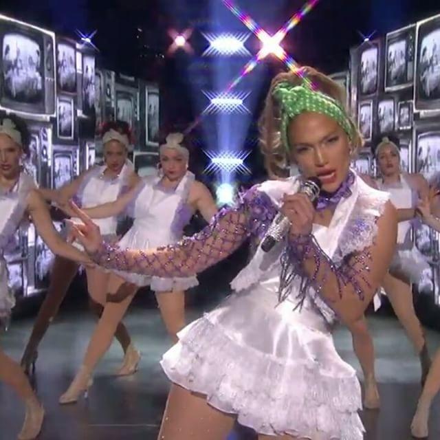 Певица выбрала для выступления откровенный наряд – короткий кружевной фартук и повязанный на голову зеленый платок. Лопес продемонстрировала все достоинства своей фигуры.