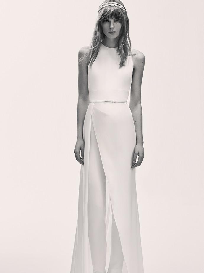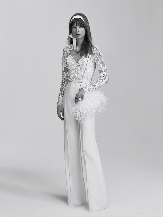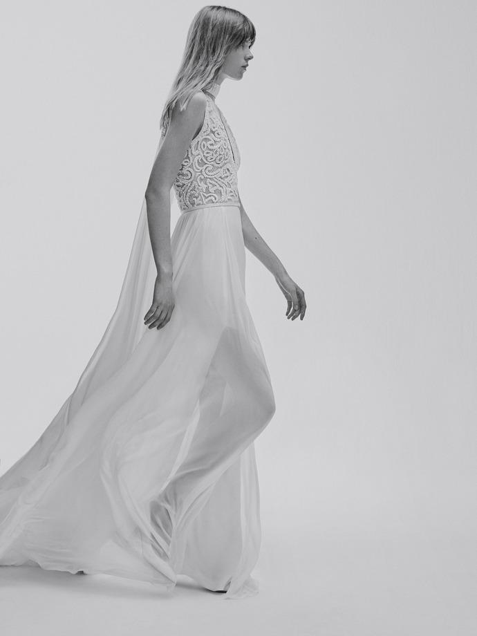 В линию Elie Saab Bridal вошли 25 нарядов в характерном для модного дома женственном стиле, включая платья-миди и комбинезон, силуэт которого стал знаковым для марки. Вещи выполнены из любимых Эли Саабом тканей - деликатного гипюра, шелка и тюля, и декорированы вышивкой и кружевом. Линию дополняют аксессуары – различные варианты фаты, украшения для волос, а также балетки, туфли на каблуке и клатчи.