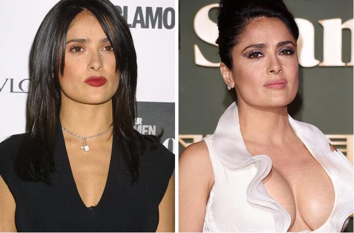 «Сальма Хайек известна своими достаточно категоричными высказываниями относительно неприемлемости пластической хирургии. Однако действительность, как это часто бывает, говорит об обратном. Актриса, как и многие ее коллеги по цеху, делала ринопластику. Кроме того, после беременности и родов была выполнена маммопластика. Сама Сальма факт операции отрицает, объясняя увеличившийся размер груди предшествующими родами. Однако объем груди, ее форма, наполненность верхней части и зоны декольте однозначно свидетельствуют о маммопластике.