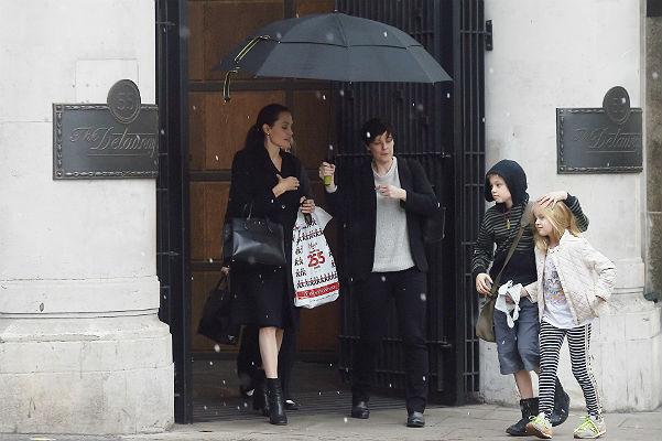 В очередной раз папарацци запечатлели Анджелину с детьми - Шайло и Вивьен - когда те выходили из лондонского ресторана The Delaunay. До этого, очевидно, семейство вновь развлекало себя шопингом: в руках актриса держит пакет из популярного магазина игрушек Hamleys.