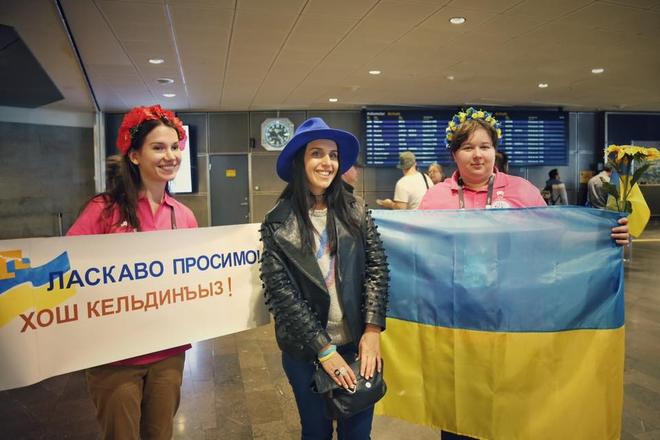 Стоит отметить, что судя по фото, которые были сделаны в аэропорту, Джамала настроена позитивно и решительно. В Стокгольме её встречали девушки с украинскими флагами, в венках и с плакатом "Ласкаво просимо".