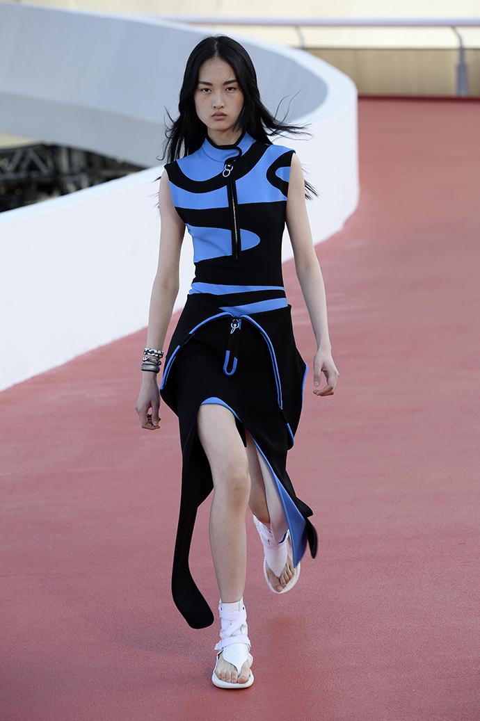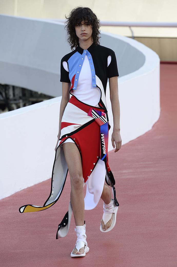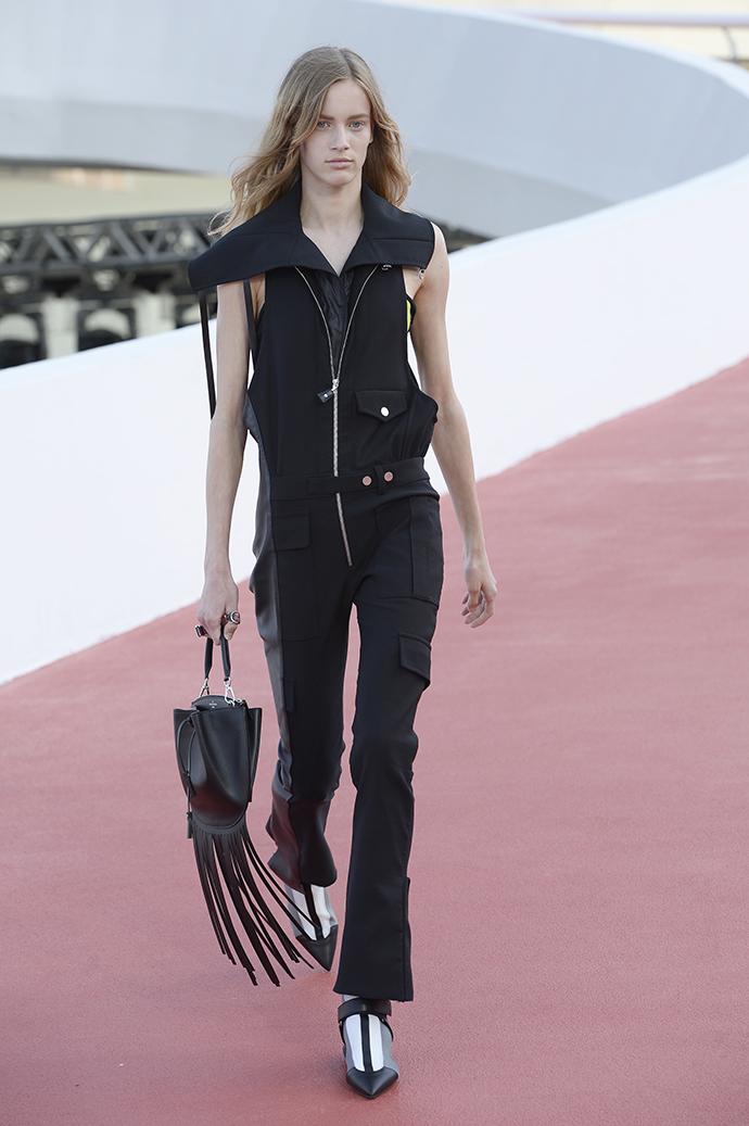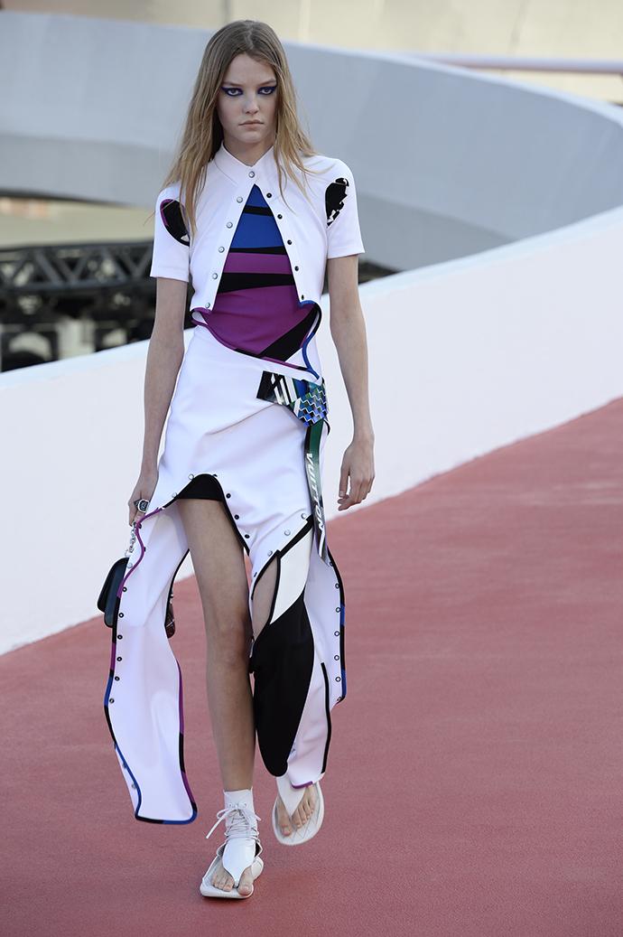 Тот же футуризм, присущий последним коллекциям Жескьера, властвовал на подиуме и на этот раз: основой круизной линейки стали асимметричные наряды в контрастных сочетаниях цветов, выглядящие как современная версия костюмов sci-fi фильмов. В эту sci-fi концепцию, замешанную с футбольной и гоночной символикой, гармонично влились все 47 образов с шоу: от мини-платьев с женственными рюшами до лаконичных комбинезонов и брючных костюмов, напоминающих униформу экранных членов экипажа космического корабля.
