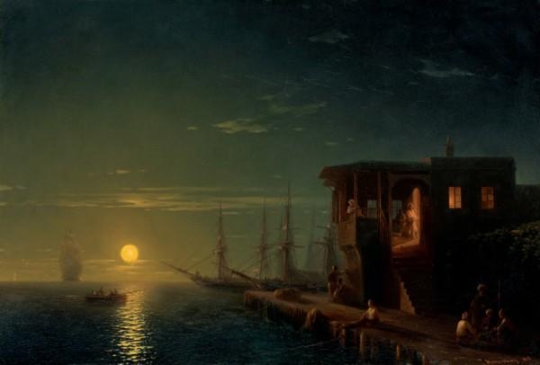 На картине запечатлена прибрежная кофейня в Константинополе. Художник интересовался турецким бытом, поэтому на картине можно разглядеть мельчайшие детали – трубки, чаши с дымящимся кофе, одежду людей. Маринист начал зарисовки в Турции и закончил картину только спустя десяток лет в Париже.