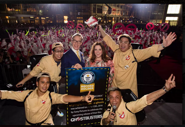 На красной ковровой дорожке, посвященной новому достижению в Книге рекордов Гиннеса, фанатов приветствовали режиссер «Охотников за привидениями» Пол Фиг и исполнительница одной из главных ролей в фильме Мелисса МакКарти.