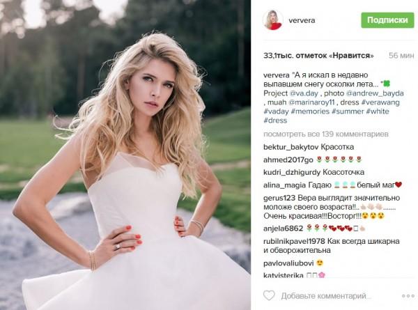 Фраза, которой Вера Брежнева сопроводила свой снимок в свадебном платье, практически повторяет слова песни, написанной Константином Меладзе, который является её супругом. Подписчики странички достаточно известной певицы, не скупились на комментарии в адрес фото своего кумира в новом образе. Менее чем за час после размещения в сети, фото набрало больше чем 33 тысячи «лайков».