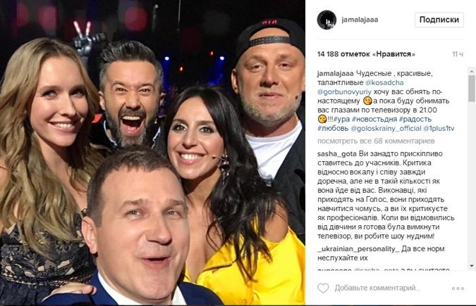 - Чудесные, красивые, талантливые Катя Осадчая и Юрий Горбунов, хочу вас обнять по-настоящему, а пока буду обнимать вас глазами по телевизору в 21.00, - написала Джамала в Инстаграм, сопроводив пост хештегами #ура #новостьдня #радость #любовь.