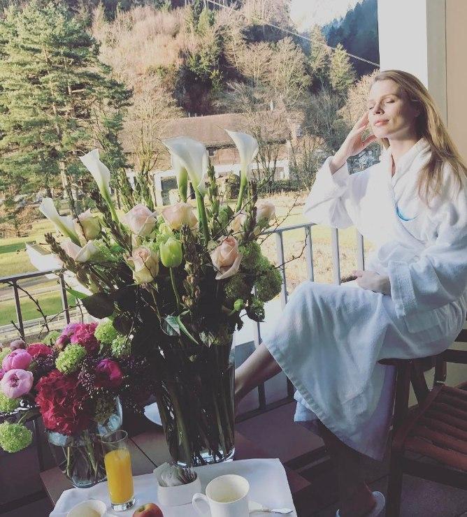 На личной страничке в Инстаграм она опубликовала снимок, на котором сидит на балконе в белом халате и просто дышит горным свежим воздухом. На столе перед ней завтрак и много цветов.