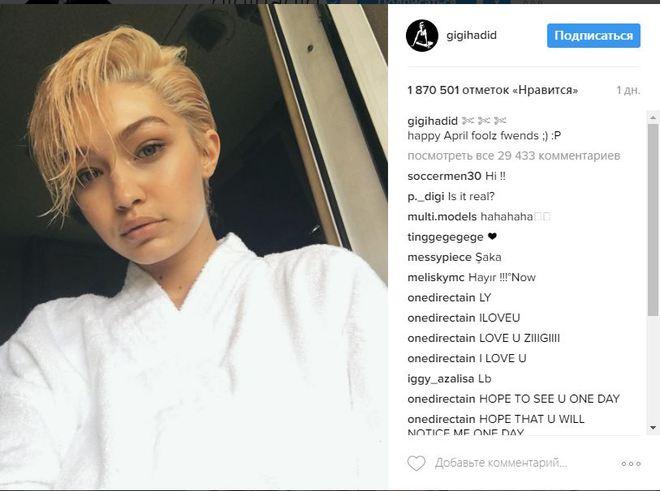 Возможно это фото была всего лишь первоапрельская шутка, а возможно в жизни Джиджи произошли большие перемены, ведь говорят, что когда девушка меняет прическу - это не спроста.