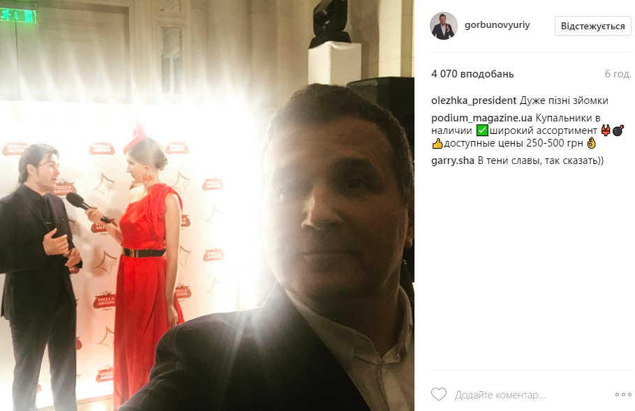 На фото Катя Осадчая, его супруга, берет интервью у министра культуры Евгения Нищука для программы «Светская жизнь», а сам Горбунов терпеливо ждет, пока она закончит.