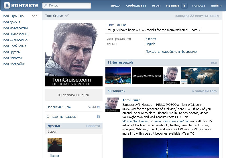 У Тома Круза появился аккаунт в российской социальной сети "ВКонтакте".
