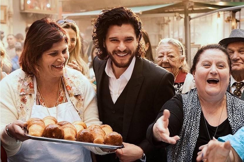Ролик о мужском парфюме - история Кита Харрингтона, который на итальянском рынке пробует вкусные пирожки.