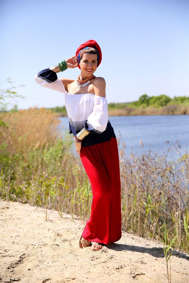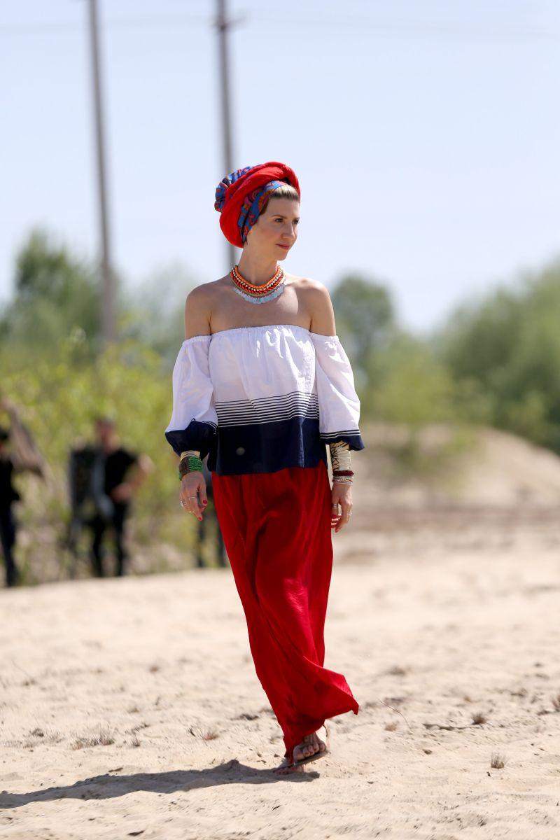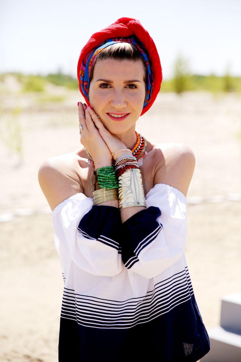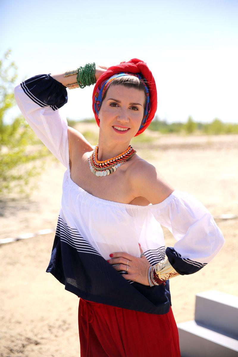 В этот четверг она примерит тюрбан на голову, множество браслетов, оголит плечи и подчеркнет узкие бедра с помощью алых брюк с завышенной талией.