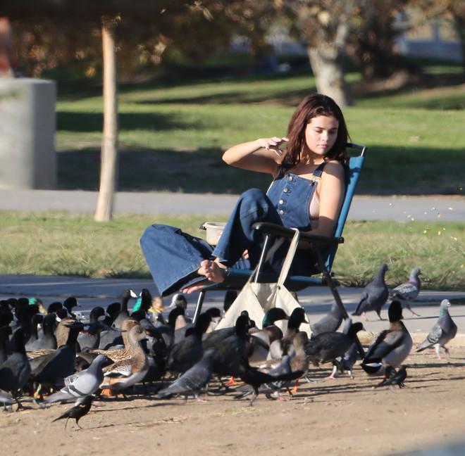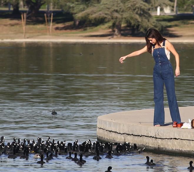 25-летняя звезда пообедала с друзьями в мексиканском ресторане под названием Casa Vega, а затем вся компания отправилась кататься на велосипедах по парку. Селена Гомес была в комбинезоне из денима, с круглой сумкой Louis Vuitton и в оранжевых сандалиях. Певица кормила голубей и уток в парке. Девушка была на прогулке без макияжа и без укладки, но ее это нисколько не волновало.