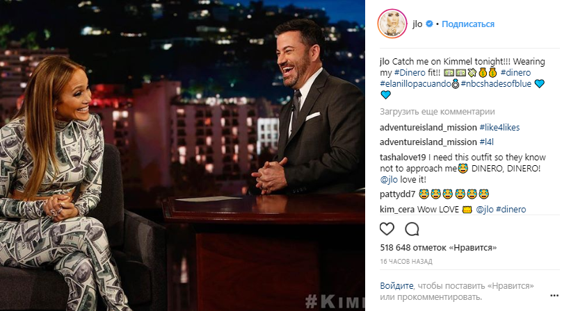 Джей Ло посетила эфир ночного шоу Джимми Киммела. Для встречи с ведущим знаменитость надела костюм доллара.