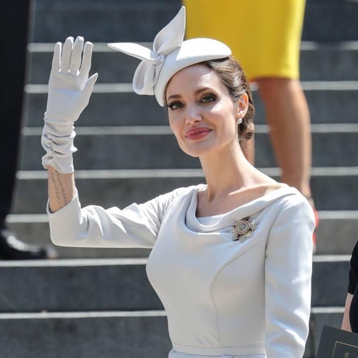 На службе Джоли появилась в элегантном платье от Ralph & Russo, которое стилисты знаменитости дополнили не менее элегантной шляпкой, перчатками и клатчем. В качестве завершения образа — изящные ювелирные украшения и тот самый орден на груди.