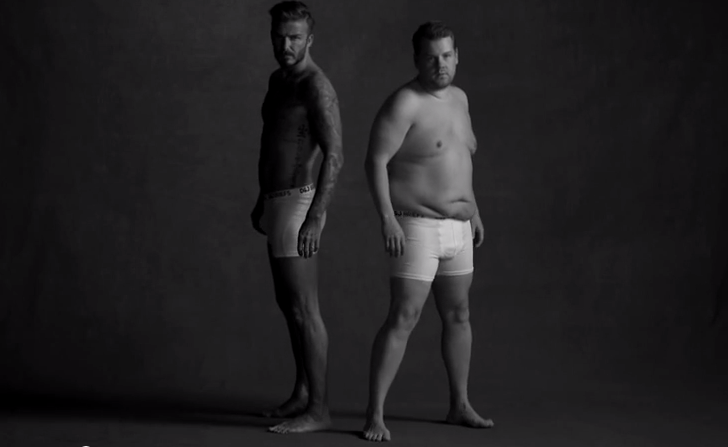 Напарником экс-футболиста стал комик Джеймс Корден, который также, как и Бекхэм, щеголял перед камерой в одних трусах, правда, без идеальных пропорций спортсмена.