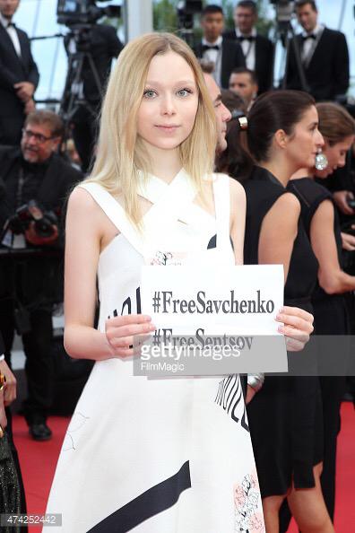 К публике актриса вышла с небольшим плакатом — призвала освободить незаконно удерживаемых в России Надежду Савченко и Олега Сенцова.