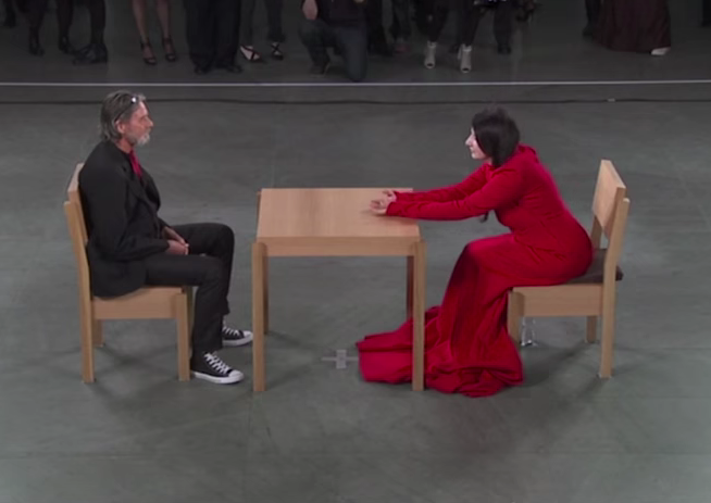 Прошло более 30 лет, и Марина лично проводила свою инсталляцию “В присутствии художника” в Музее Современного Искусства в Нью-Йорке. Идея перформанса заключалась в том, что художница в течение 1 минуты молча обменивалась взглядами с любым посетителем, который сядет напротив неё. Эти моменты взаимодействия двух людей фиксировались фотографом.