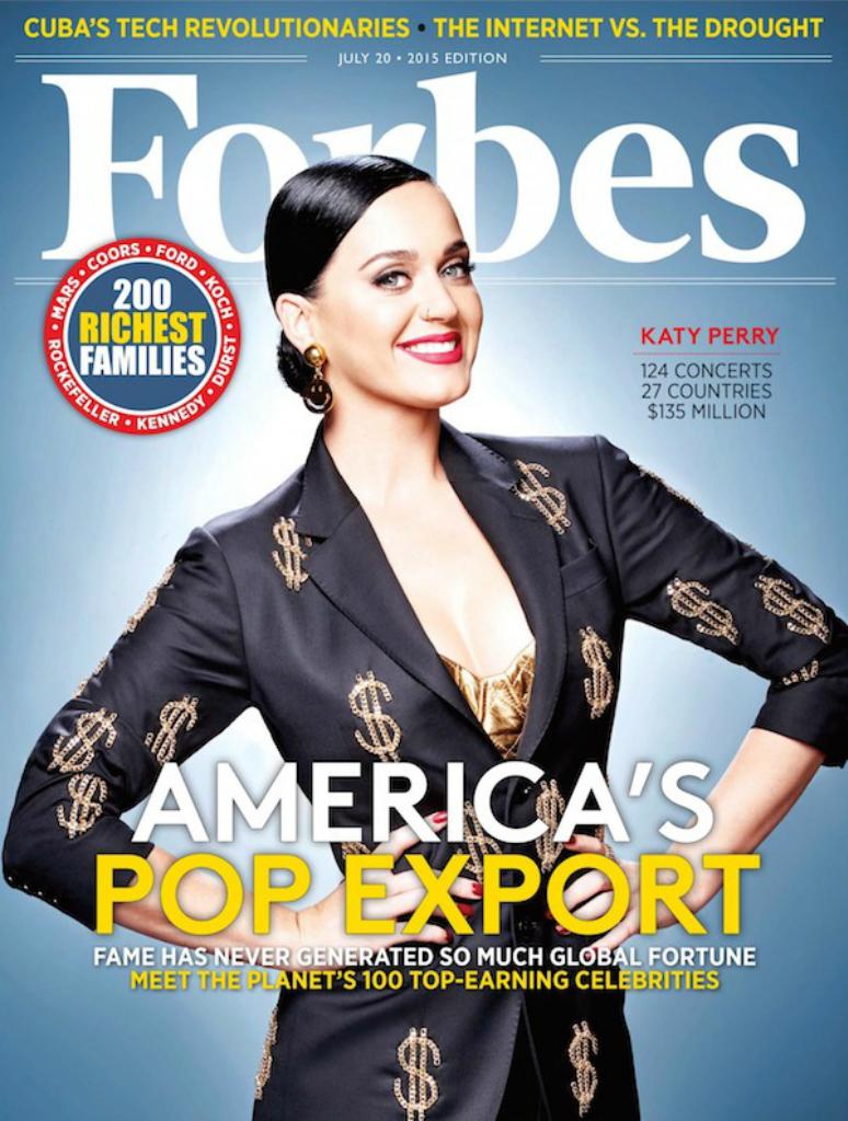 Обложка нового выпуска Forbes выпуска досталась Кэти Перри, которая заняла третью строчку с доходом в 135 миллионов долларов.