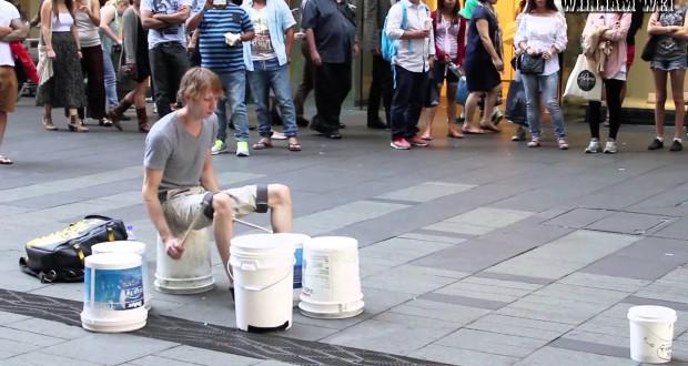 Удивляет даже не место, а инструмент, на котором играет парень, ведь это самые обычные вёдра! И правда, зачем покупать дорогое оборудование, если можно использовать подручные средства?!