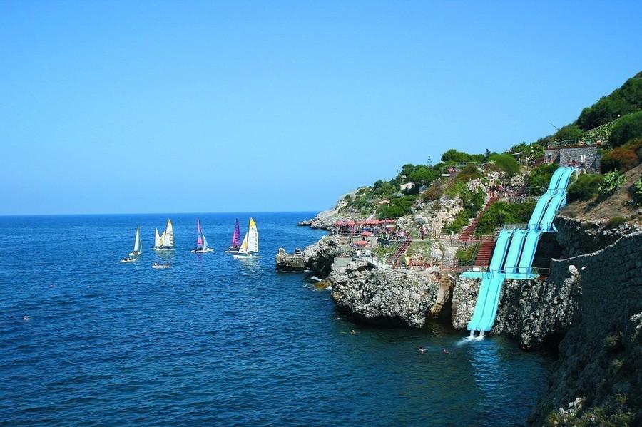 На территории отеля Citta del Mare прямо на склоне находятся три горки. Спускаясь по ним, можно задержаться в одном из трех бассейнов, а можно скатиться прямо в Средиземное море.