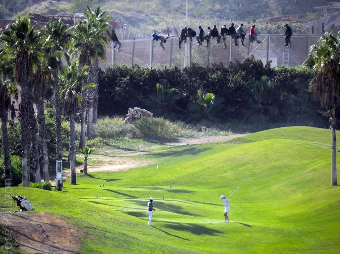 Магнитом желающих попасть в Европу притягивают два крошечных испанских анклава в Марокко — Мелилья и Сеута. Здесь Африку от европейского государства отделяет лишь проволочный забор. На снимке, сделанном фотографом Хосе Палазоном, работавшим в группе по защите прав мигрантов Pro.De, в Мелилье один из игроков в гольф наблюдает за тем, как мигранты пытаются перебраться через забор. Рядом полицейский по лестнице поднимается к ним наверх. Фотограф называет этот момент символическим.