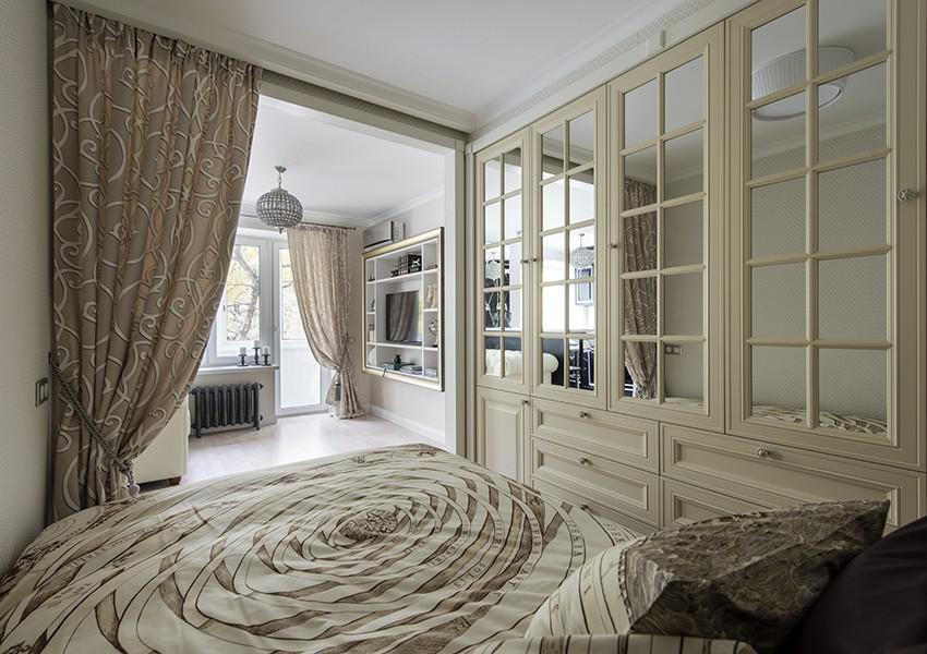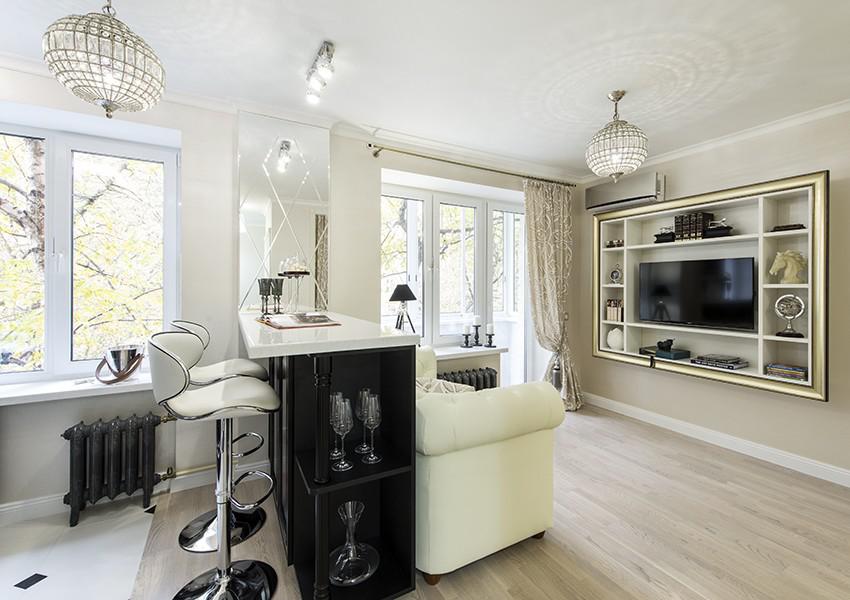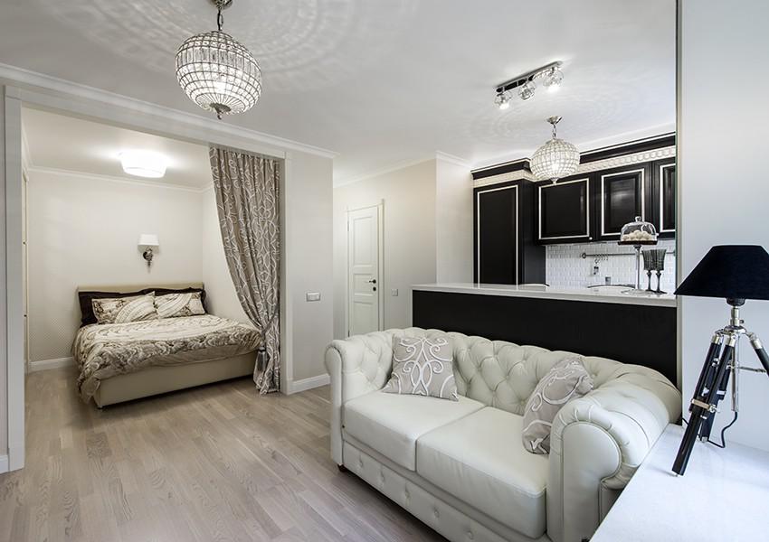 Представляем вам необычный вариант того, как можно обставить квартиру, площадь которой составляет меньше 30 квадратных метров. Для того чтобы визуально расширить пространство, дизайнеры использовали зеркала в интерьере, а также предложили выполнить обстановку мебели и аксессуаров в светлых бежевых тонах, что существенно успокаивает глаз.