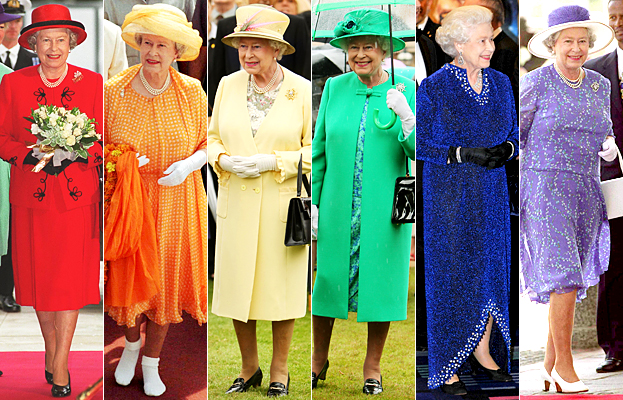 Очень важно, чтобы цвет одежды не просто подходил королеве, но и был уместен для конкретного мероприятия. Королеву должно быть хорошо видно. Если шьют наряд, в котором Ее Величество будет, например, сажать дерево, то для него ни в коем случае не выберут зеленый цвет, иначе королева сольется с фоном. Для посещения школы дизайнеры выбираю яркие, веселые цвета и используют различные детали вроде перьев, завитков, цветов и резинок. Цвета могут иметь символическое значение, например, черный — соболезнование, желтый — радость.
