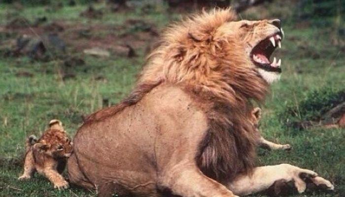 Взрослый лев подыгрывает львенку в игре, изображая страдания от укуса.
