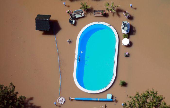 Бассейн с прозрачной водой посреди затопленных наводнением территорий.