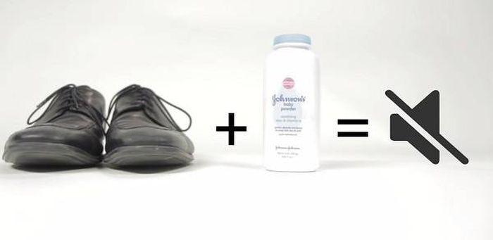 7. Еще один лайфхак: чтобы убрать неприятный скрип, а также запах, насыпьте в обувь немного детской присыпки.
