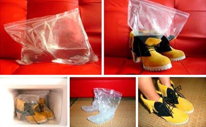 Наберите воду в пакеты с застежкой и положите их внутрь обуви. Затем поставьте ее в морозильную камеру. Вода в пакете будет расширяться и обувь вместе с ней.