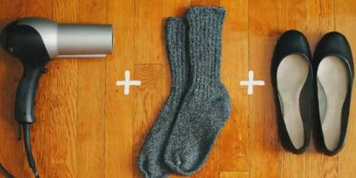 3. Если обувь Вам мала, наденьте ее с шерстяными носками. Направьте горячий воздух из фена на обувку. После нескольких минут выключите фен.