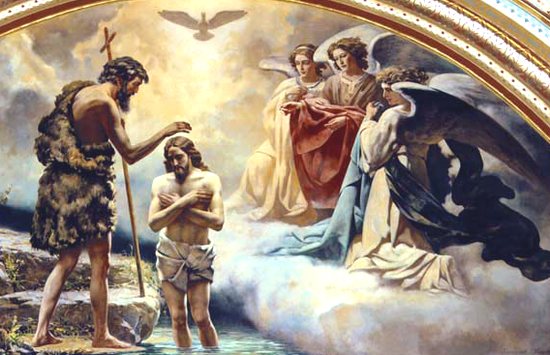 И вот к нему приходит Иисус из Назарета. Иоанн, считая себя недостойным крестить Иисуса, стал удерживать Его, говоря: «Мне надобно креститься от Тебя, и Ты ли приходишь ко мне?». Но Иисус сказал ему в ответ: «Оставь теперь; ибо так надлежит нам исполнить всякую правду» (Мф. 3, 14-15).