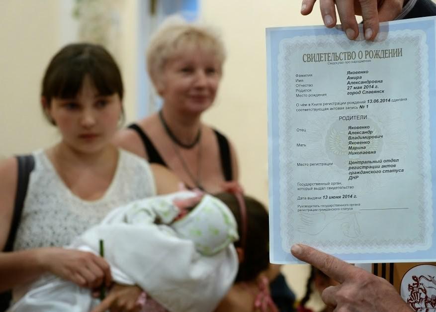 Для таких как Варя, рожденных в «ДНР», есть два способа получения документов на территории «республики». В любом ЗАГСе на подконтрольной боевикам части Донецкой области, предъявив справку из роддома, паспорта и свидетельство о браке родителей, можно оформить свидетельство о рождении образца непризнанной «республики». Судя по соцсетям, некоторые родители так и делают. В Донецке, например, первое такое свидетельство выдали летом.