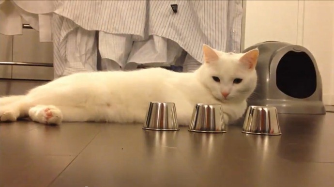 "Кошки и собаки очень умны. Но я выкладываю это видео не для того, чтобы показать, как сообразителен Кидо, а чтобы поделиться радостью, что мой кот с удовольствием играет со мной и каким-то образом (может быть, наугад) достигает больших успехов", - пишет владелица чудо-кота в описании к ролику под названием "Kido's First Shell Game" ("Первая игра Кидо в наперстки"). На видео запечатлено, как белый кот каждый раз безошибочно определяет, под какой чашкой находится серебристый шарик.