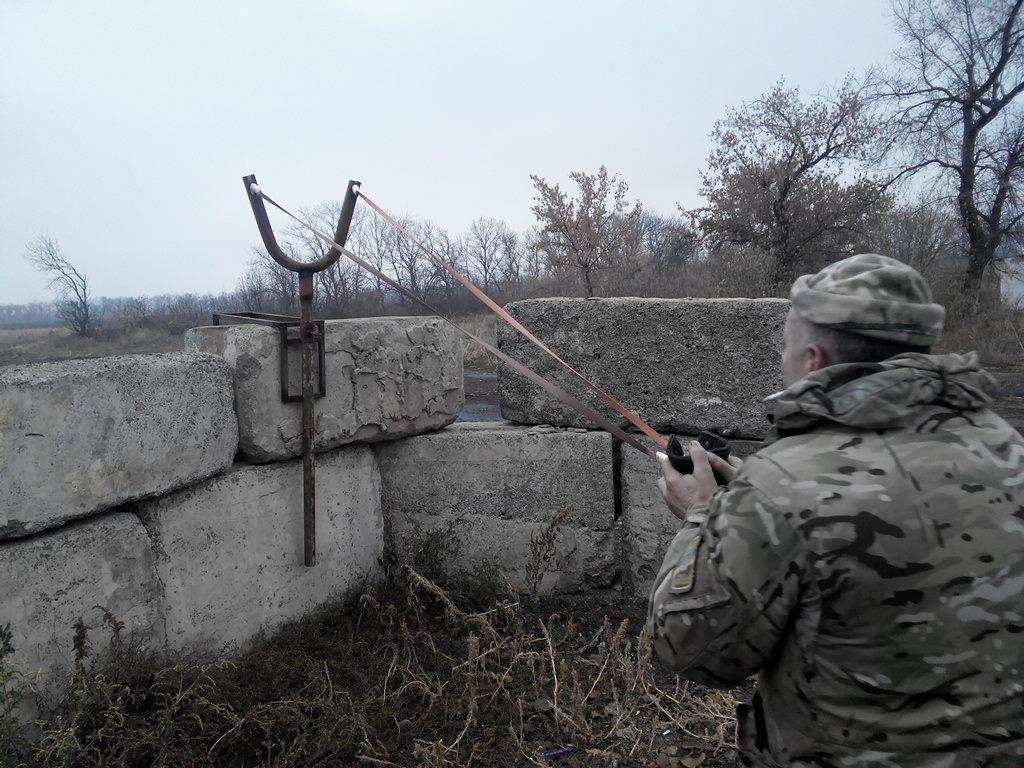 “Новая разработка украинских оружейников: СРК-1 - Самонатягиваемый рогатый камнемет "Минск". Прицельная дальность - до 50 метров. Калибр камней - до 100 мм. Бесшумное, не огнестрельное оружие, полностью отвечающее требованиям перемирия”, - подписал фото Бутусов.