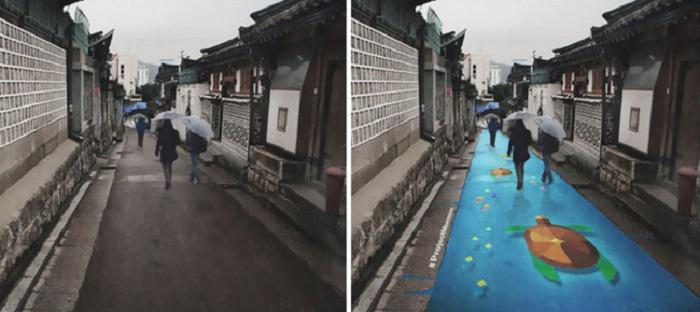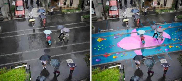 Но группа дизайнеров из Чикагского института искусств нашла выход из этой ситуации. Отправившись в Сеул (Южная Корея, там сейчас наблюдается сезон проливных дождей), дизайнеры разрисовали серые и мрачные тротуары шумного города. Урбанистические джунгли вдруг заиграли яркими красками.