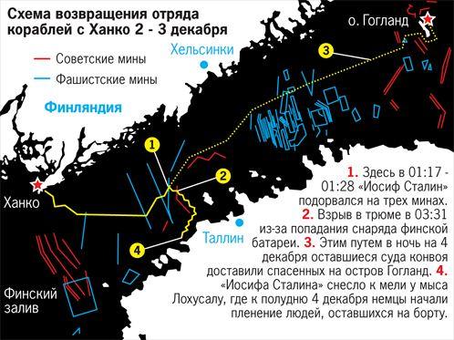 2 декабря 1941 года в 21:00 отряд кораблей вышел из гавани полуострова Ханко и взял курс на остров Гогланд, где располагалась советская военная база. На корабли приняли более 8600 эвакуируемых защитников Ханко, из них около 5600 человек - на "Иосифа Сталина", до 600 - на каждый из эскадренных миноносцев и по 300 человек на каждый изшести тральщиков. В 01:09 отряд попал на минное заграждение. В течение четырех минут у четырех передних тральщиков полностью или частично вышли из строя тралы. Дальше конвой пошел, что называется, "на ощупь". Никто не мог гарантировать безопасного прохода, но отступать уже было некуда.