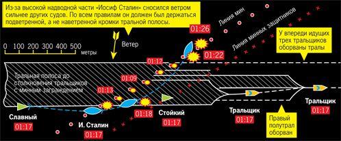 Тральщики не обнаружили не только немецкое, но и родное минное поле, отмеченное на секретных картах. Прошел, не задев мин, и эсминец. А "Сталину" не повезло...